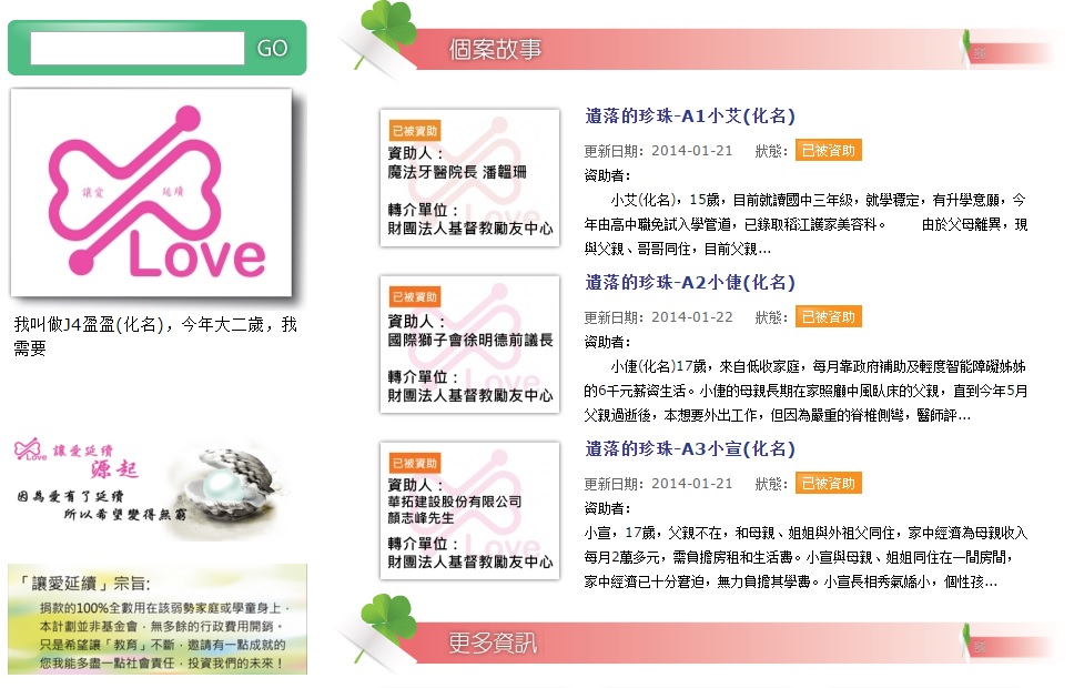 其中的台灣撿珍珠助學計畫主要是幫助台灣急難家庭子女完成學業!! 人生在世,除了吃、喝、玩樂能讓我們感到心情愉快外,如果能盡自已的力量,幫助到有需要的人,把行善變成一種習慣,那也是一件讓人很快樂又有意義的事情!邀請您一同參與讓愛延續計劃。