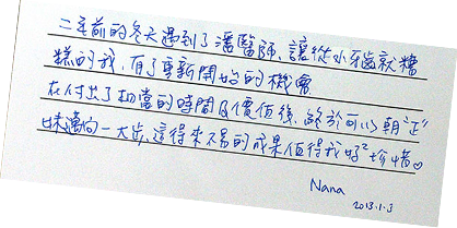 二年前的冬天遇到了潘醫師,讓從小牙齒就糟糕的我,有了重新開始的機會。在付出了相當的時間及價值後,終於可以朝”正”妹邁向一 大步,這得來不易的成果值得我好好珍惜。