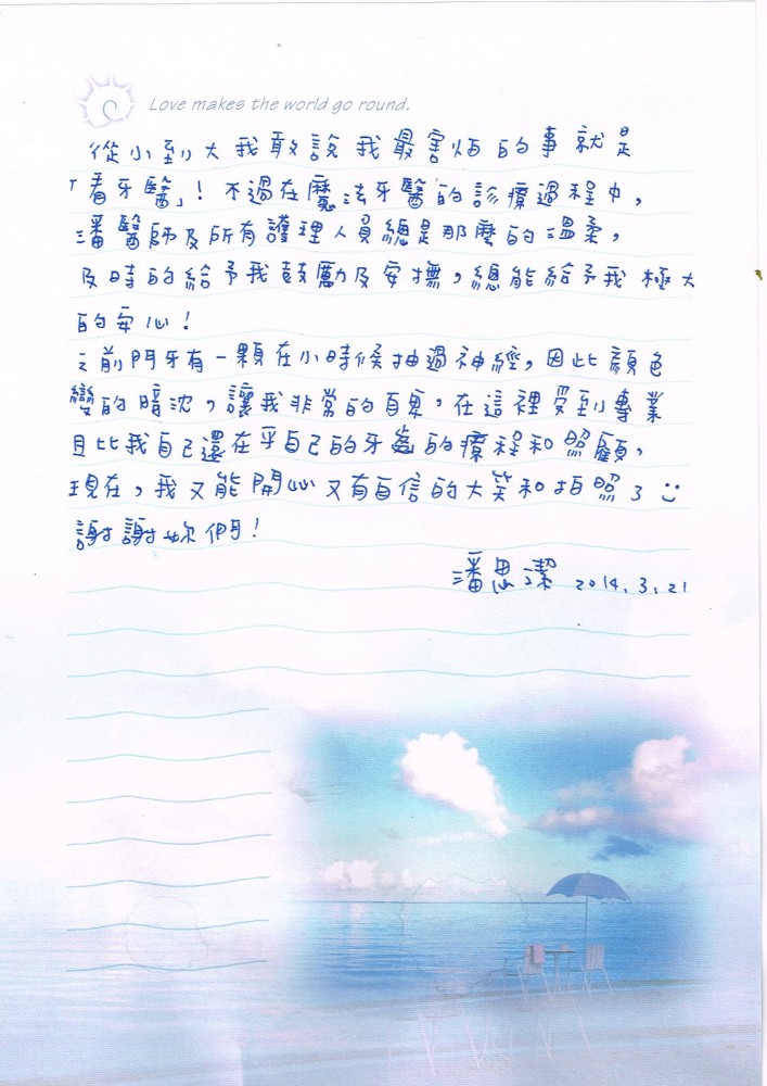 從小到大我敢說最害怕的事就是「看牙醫」!不過在魔法牙醫的診療過程中,潘醫師及所有護理人員總是那麼的溫柔及的給予我鼓勵及安撫,總能給予我極大的安心!