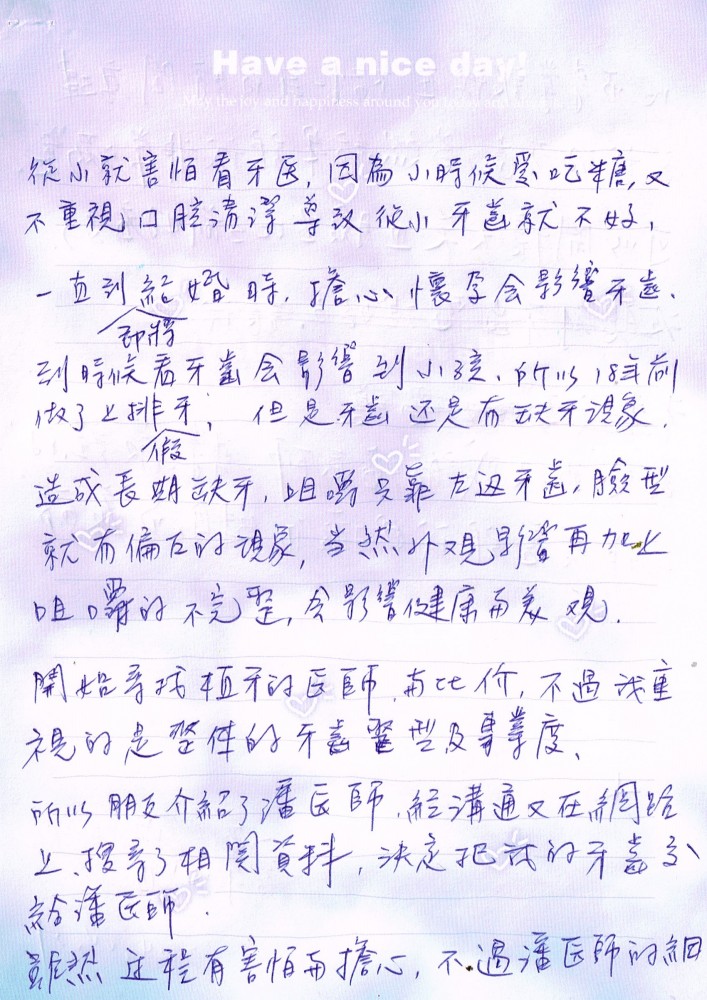 從小就害怕看牙醫,因為小時候愛吃糖,又不重視口腔清潔導致牙齒從小就不好,一直到將結婚時,擔心懷孕會影響牙齒,到時候看牙齒會影響到小孩,所以18年前做了上排假牙,但是牙齒還是有缺牙現象,造成長期咀嚼只靠左邊,臉形就有偏右的現象,當然外觀影響加上咀嚼的不完整,會影響健康與美觀。
