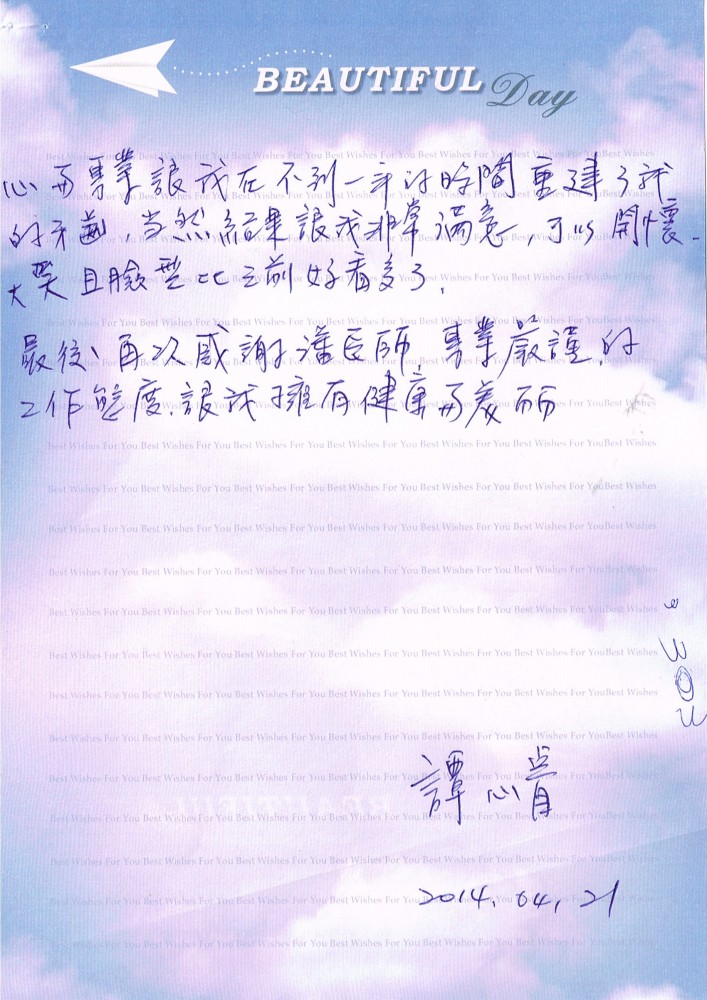 雖然有害怕與擔心,不過潘醫師的細心與專業讓我在不到一年的時間重建了我的牙齒,當然結果我很滿意!!可以開懷大笑且臉型好看多了!!