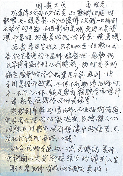 認識潘醫生很久,只知她是一位熱心公益,能言善道的牙醫師,雖然她一再勸我及早將牙齒修好以利健康。幼時看牙的痛苦陰影始終令我裹足不前,直到一次牙周萎縮而敏感,不得不求助潘醫師時才一不做二不休,鼓足勇氣乾脆全面整修一番,真是”既期待又怕受傷害”!