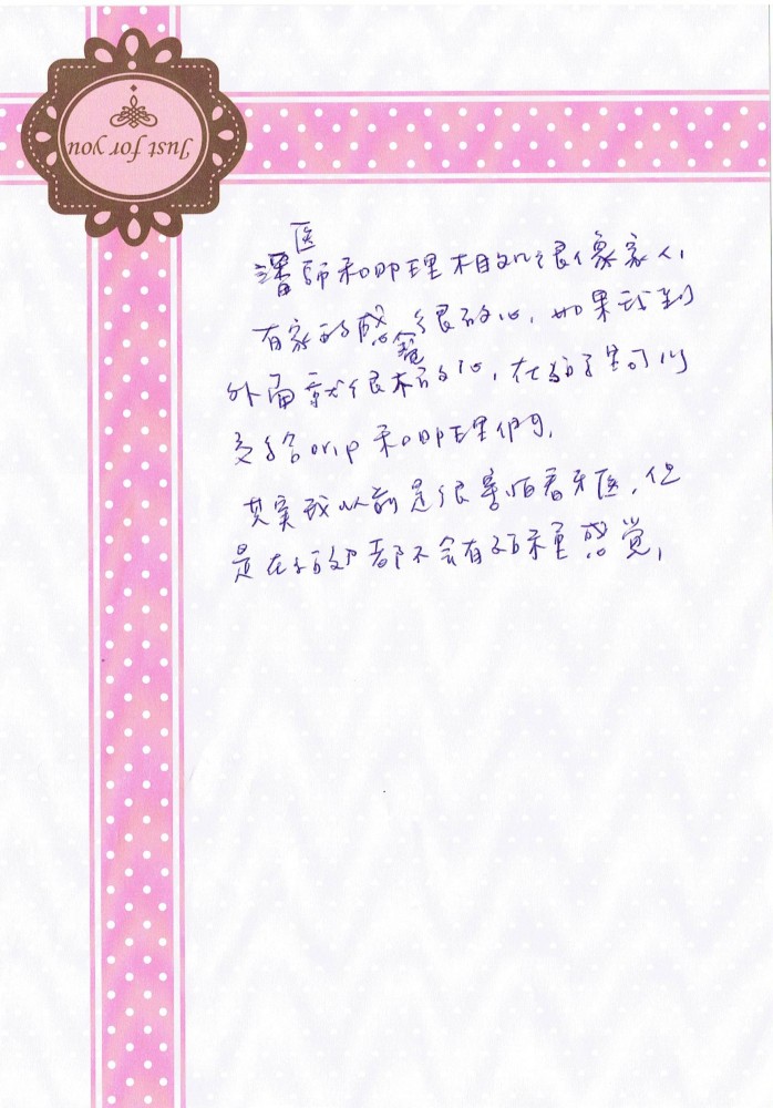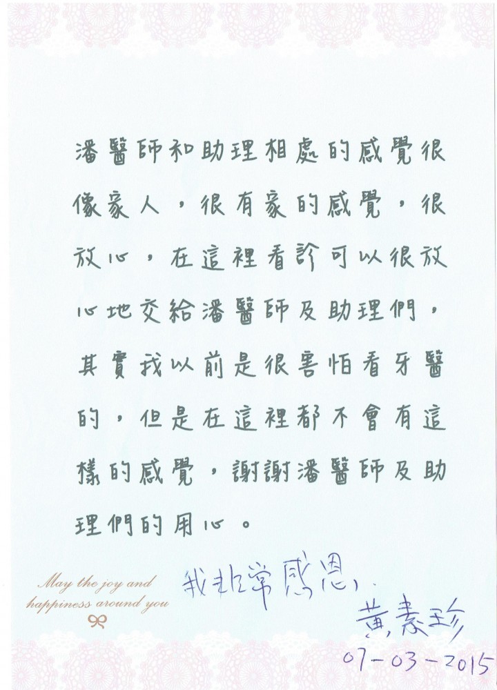 潘醫師和助理相處的感覺很像家人,很有家的感覺,很放心,在這裡看診可以很放心地交給潘醫師及助理們,其實我以前是很害怕看牙醫的,但是在這裡都不會有這樣的感覺,謝謝潘醫師及助理們的用心。