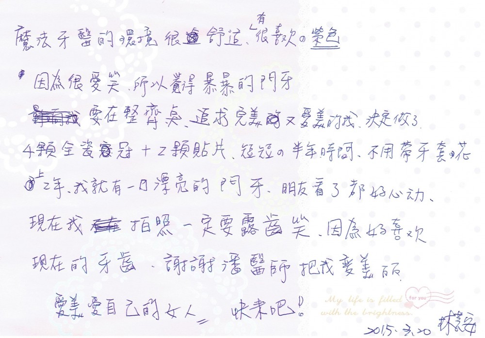 魔法牙醫的環境很舒適,有很喜歡的紫色,因為很愛笑,所以覺得爆爆的門牙要再整齊點,追求完美又愛美的我決定做了4顆全瓷冠+2顆貼片,短短的半年時間,不用戴牙套花上2年,我就有一口漂亮的門牙,朋友看了都好心動,現在我拍照一定要露齒笑,因為好喜歡現在的牙齒,謝謝潘醫師把我變美麗,愛美愛自己的女人快來吧!