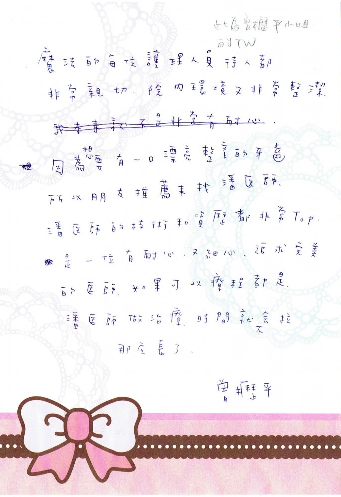 魔法的每位護理人員待人都非常親切,院內環境又非常整潔,因為想要有一口漂亮整齊的牙齒,所以朋友推薦找潘醫師,潘醫師的技術和資歷都非常TOP,是一位有耐心又細心、追求完美的醫師,如果可以療程都是潘醫師做治療,時間就不會拉那麼長了。