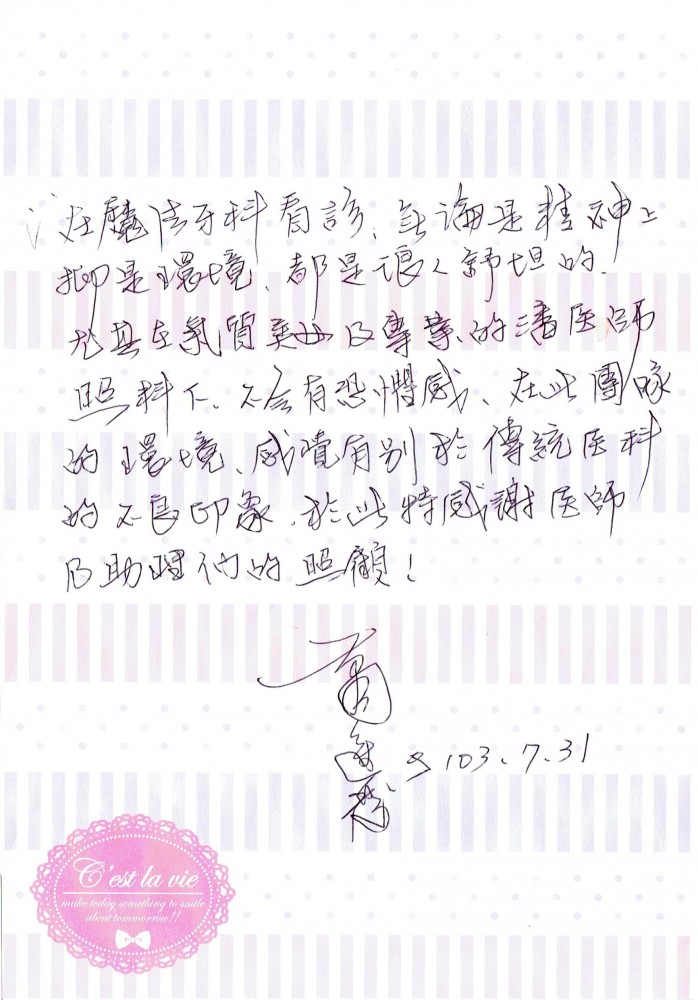 在魔法牙科看診,無論是精神上抑是環境,都是讓人舒坦的,尤其在氣質美女級專業的潘醫師照料下,不會有恐懼感,在此團隊的環境,感覺有別於傳統醫科的不良印象,於此特感謝醫師及助理們的照顧。蕭進發 2014.07.31