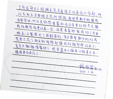之前在節目上被網友笑牙齒很不好看信心受創,所以去知名牙齒矯正診所諮詢發現要動手術讓我非常害怕,所以來詢問潘醫師有沒有更好的方法讓我的臉型能更好看一些,結果潘醫師幫我做了牙齒矯正,又幫我打了四顆骨釘,原本需要動手術的我竟然只花了兩年的時間就讓我的臉型變好看了!真是太謝謝潘醫師了,現在還有人稱我小臉美女呢!讓我更有自信了!